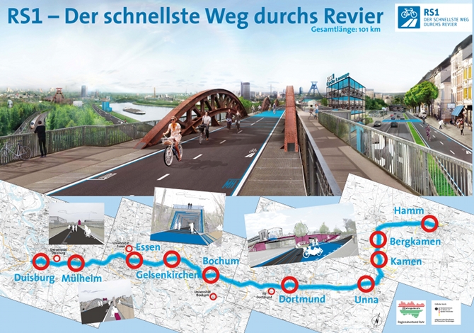 Proprio la città tedesche, invece, al momento vantano del le piste ciclabili molto strette, alcune finiscono nel nulla o sulle corsie preferenziali dei bus. Ma è pronta a mettersi al passo coi tempi e con gli Stati confinanti, grazie a nuovi percorsi ciclabili ampi 3,6 metri, con corsie di sorpasso e con sovrappassi/sottopassaggi per evitare l’incontro con auto e motociclette. Ma la Germani può vantare un fiore all’occhiello nella nuova politica green: la Rs1 ( Rs sta per Radschnellweg, strada veloce per le bici tradotto letteralmente), una superstrada da 100 km nella regione della Ruhr, una volta centro metallurgico ora riconvertito a turismo e ambiente, di cui cinque già realizzati a Mülheim. Quattro metri per le bici e ben due separati per i pedoni.
